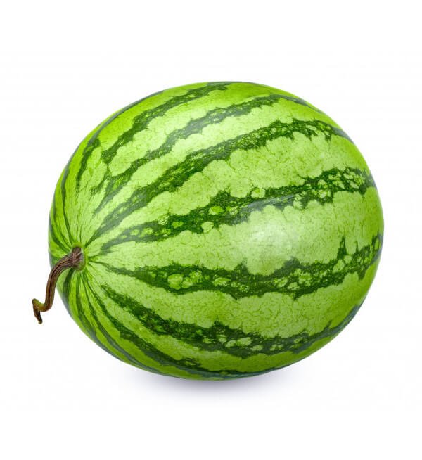 Watermelon is a very large vine fruit that grows on the ground. It has a hard, green-striped skin which is inedible. Inside is a soft, bright pink-red flesh with black seeds, both of which can be consumed.